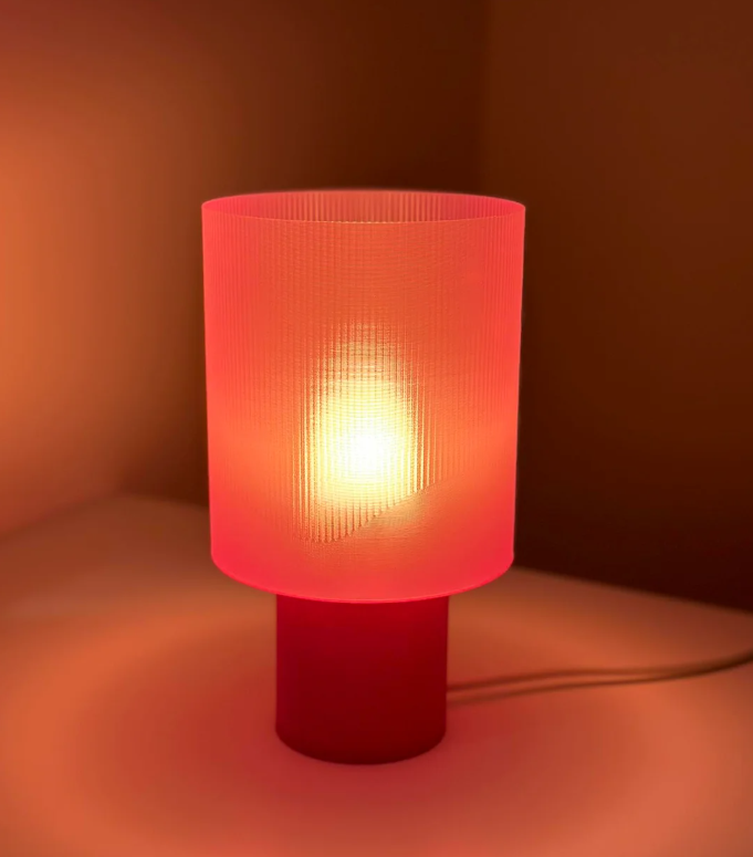 Matériaux légers mais robustes : corps et abat-jour en polypropylène recyclé, finition striée qui joue avec les reflets de la lumière.