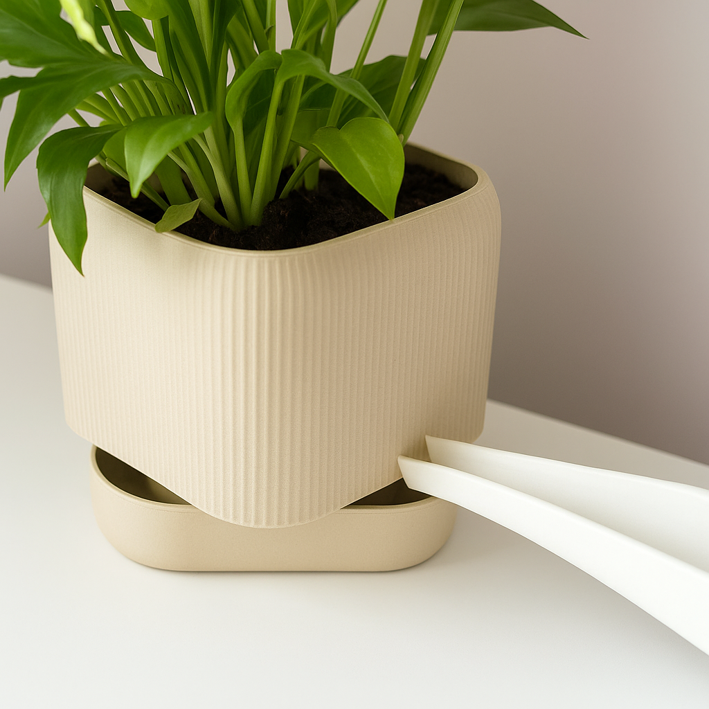 Sous le pot décoratif se cache un réservoir discret ; des mèches capillaires plongent dans l’eau et remontent l’humidité jusqu’aux racines au rythme de leurs besoins. Une fente frontale permet de remplir le réservoir sans déplacer la plante : pratique et propre, même sur un bureau ou un rebord de fenêtre.