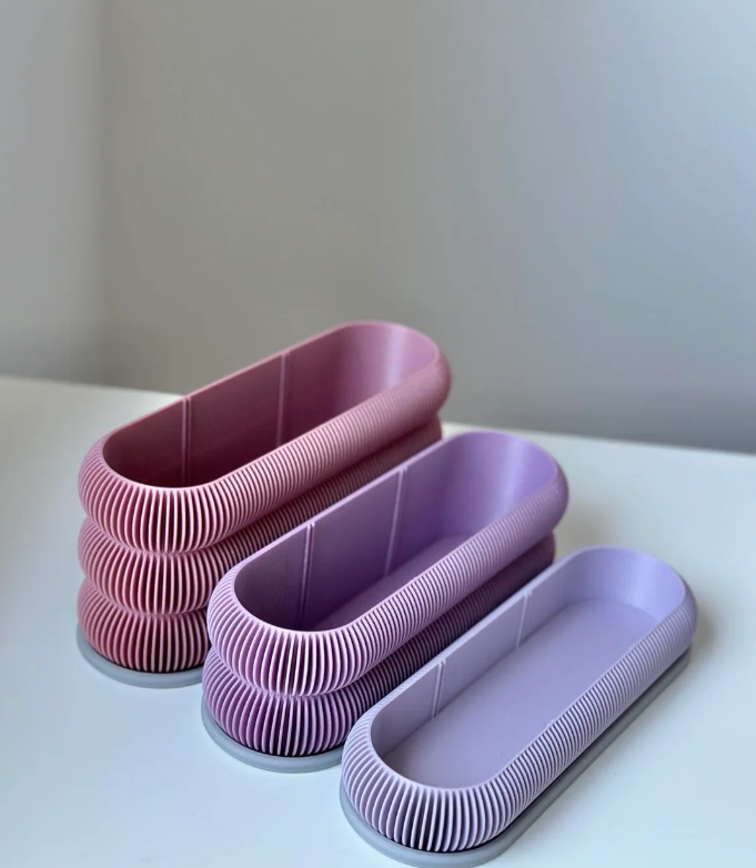 Design 3-en-1 modulable : trois bacs ovales (rose blush, violet orchidée et lilas brume) que vous pouvez utiliser séparément ou superposer pour un gain de place immédiat.